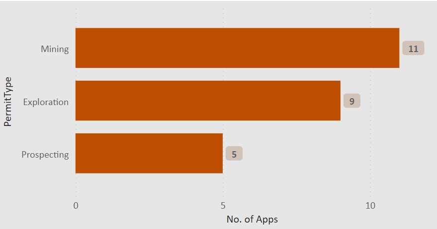 11 were for mining permits, 9 were for exploration permits, 5 were for prospecting permits.