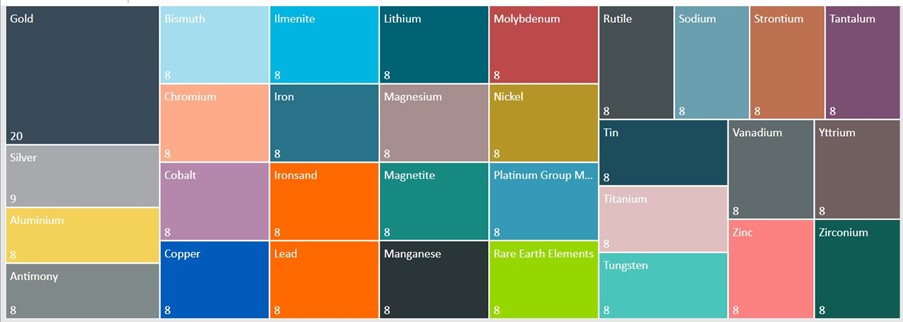 This graph shows the types of minerals. Gold 20, Silver 9, Aluminium 8, Antimony 8, Bismuth 8, Chromium 8, Cobalt 8, Copper 8, Ilmenite 8, Iron 8, Ironsand 8, Lead 8, Lithium 8, Magnesium 8, Magnetite 8, Manganese 8, Molybdenum 8, Nickel 8, Platinum Group Minerals 8, Rare Earth Elements 8, Rutile 8, Sodium 8, Strontium 8, Tantalum 8, Tin 8, Titanium 8, Tungsten 8, Vanadium 8, Yttrium 8, Zinc 8, Zirconium 8.