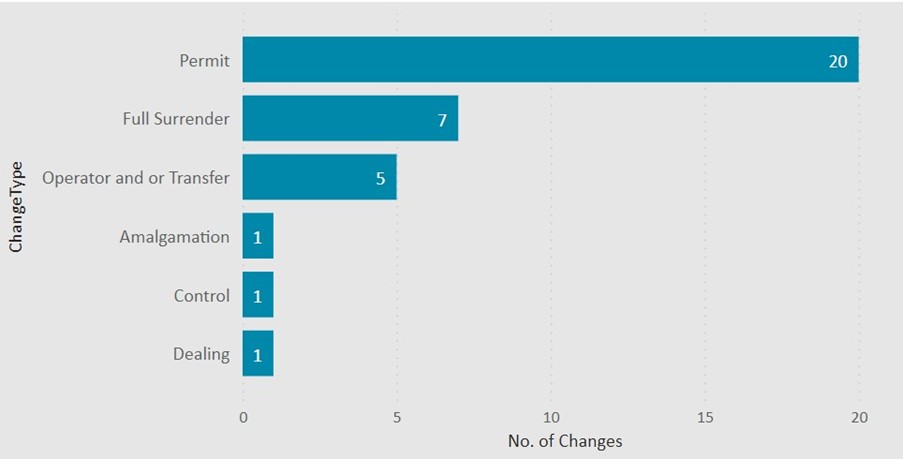 This graph shows 20 of the change applications we made decisions on were for the 'permit' category, 7 were for full surrenders of a permit, 5 were for change in operator or transfer, 1 was for amalgamation of a permit, 1 was for a change of control, 1 was for a consent for a dealing.