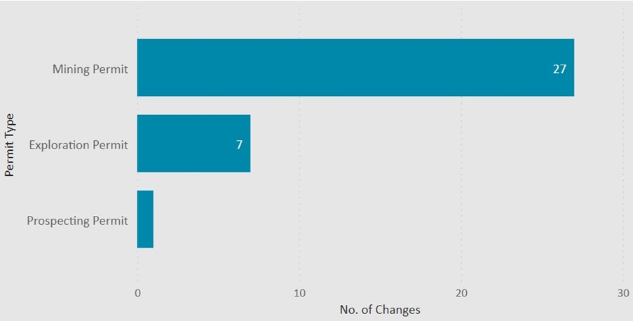 The graph shows 27 of the change applications we made decisions on were for mining permits, 7 were for exploration permits and 1 was for a prospecting permit.